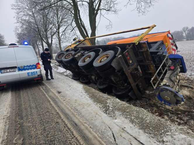Pługopiaskarka wylądowała w rowie. Trudne warunki na drogach w powiecie wschowskim