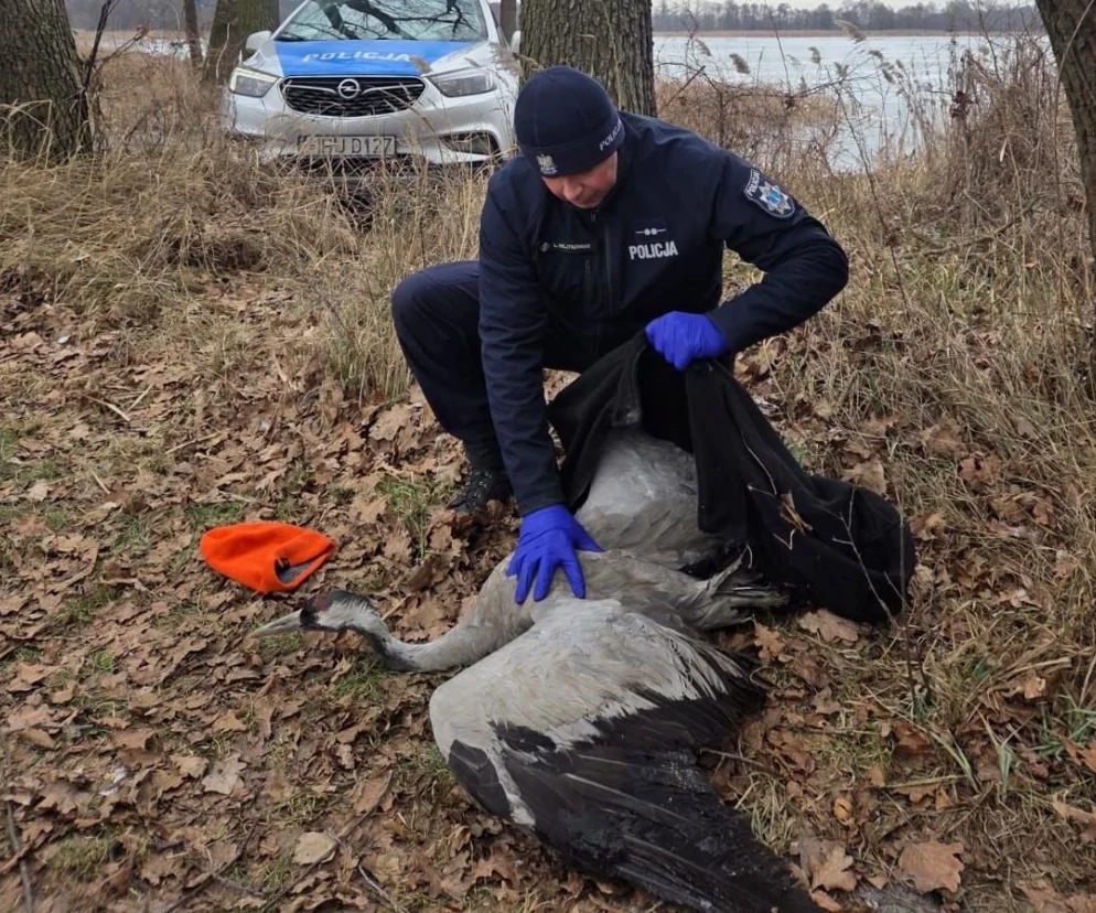 - Policjanci natychmiast podjęli interwencję, bez zwłoki powiadamiając pracowników Urząd Gminy Osieczna odpowiedzialnych za ochronę środowiska. Po przybyciu na miejsce okazało się, że leżący na lodzie żuraw jest skrajnie wycieńczony i zmarznięty. Można śmiało powiedzieć, że pomoc przyszła na czas. Ptak został owinięty w ciepłe okrycie i przewieziony do Ośrodek Rehabilitacji Dzikich Zwierząt w Kościanie, gdzie trafił w ręce specjalistów - mówi Monika Żymełka, oficer prasowy Komendy Miejskiej Policji w Lesznie.
