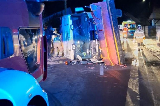 Strażacy odłączyli akumulatory w pojeździe, zabezpieczyli wyciek płynów z pojazdu i usunęli piasek, który się z niego wysypał. Wezwana na miejsce pomoc drogowa postawiła ciężką pługopiaskarkę na koła. Straty w wyniku zdarzenia oszacowano na 100 tys. złotych.