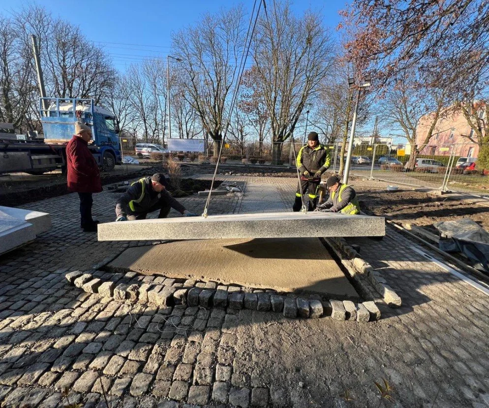 Budowa pomnika w Lesznie weszła w kolejny etap. Po wcześniejszym przygotowaniu terenu rozpoczął się montaż elementów kamiennych obeliska. Na plac budowy dostarczono kilka ton granitu, z którego powstaje główna konstrukcja monumentu. Prace prowadzone są przy Zespole Szkół Technicznych CKZiU.