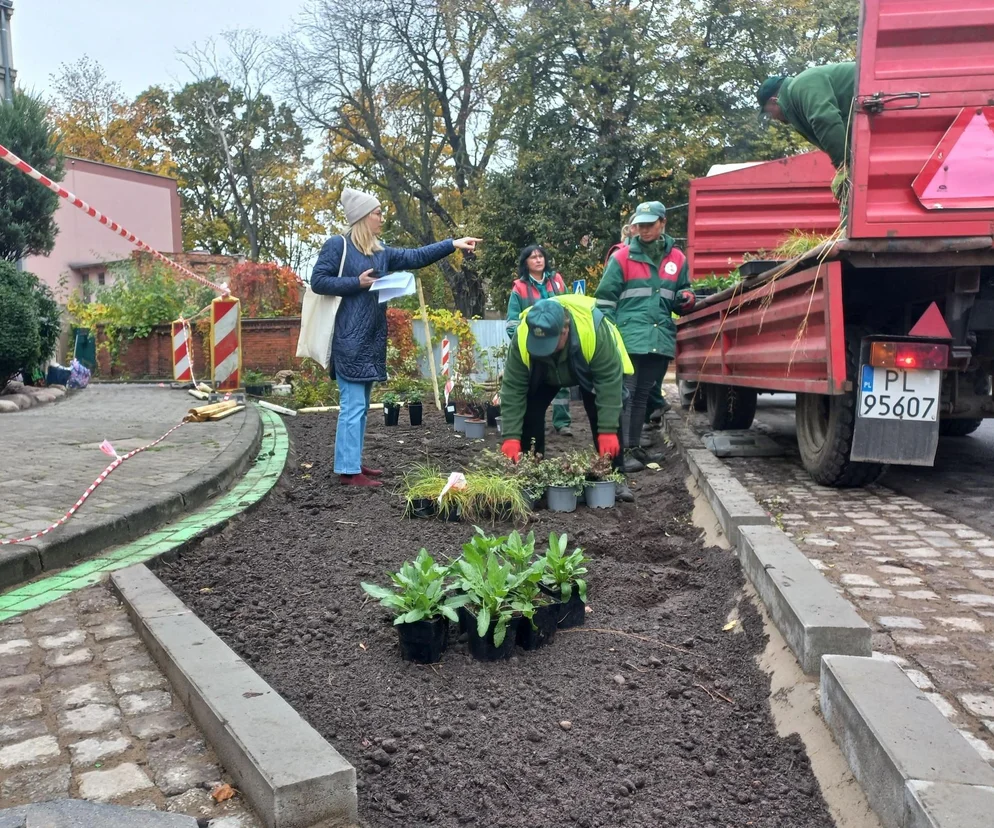 - Jesteśmy u zbiegu ulicy Wałowej, Więziennej i Tylnej. I te miejsca budziły chyba najmniej jednak kontrowersji. Od początku samego procesu i działań na Placu Powstańców mówiłyśmy o tym, że te martwe trójkąty, martwe pola, które są u zbiegu Wałowej, Więziennej i Tylnej chcemy odbetonować. Natomiast wiedziałyśmy od początku, że nie nastąpi to w okresie letnim, ani wiosennym tylko jesiennym, bo na ten okres byliśmy gotowi z Miejskim Zakładem Zieleni i na ten moment jesienny przewidywaliśmy te prace. Dlatego te martwe pola zostały też wymalowane na zielono i ustawiono w nich donice tymczasowo, żeby pokazać jakie będą zmiany. Tu, gdzie miejsc parkingowych nie było, było morze asfaltu, miejsce u zbiegu skrzyżowań, zrywamy asfalt i wykonujemy nasadzenia - mówi Natalia Grobelna pełnomocnik ds. zieleni i estetyki miasta.
